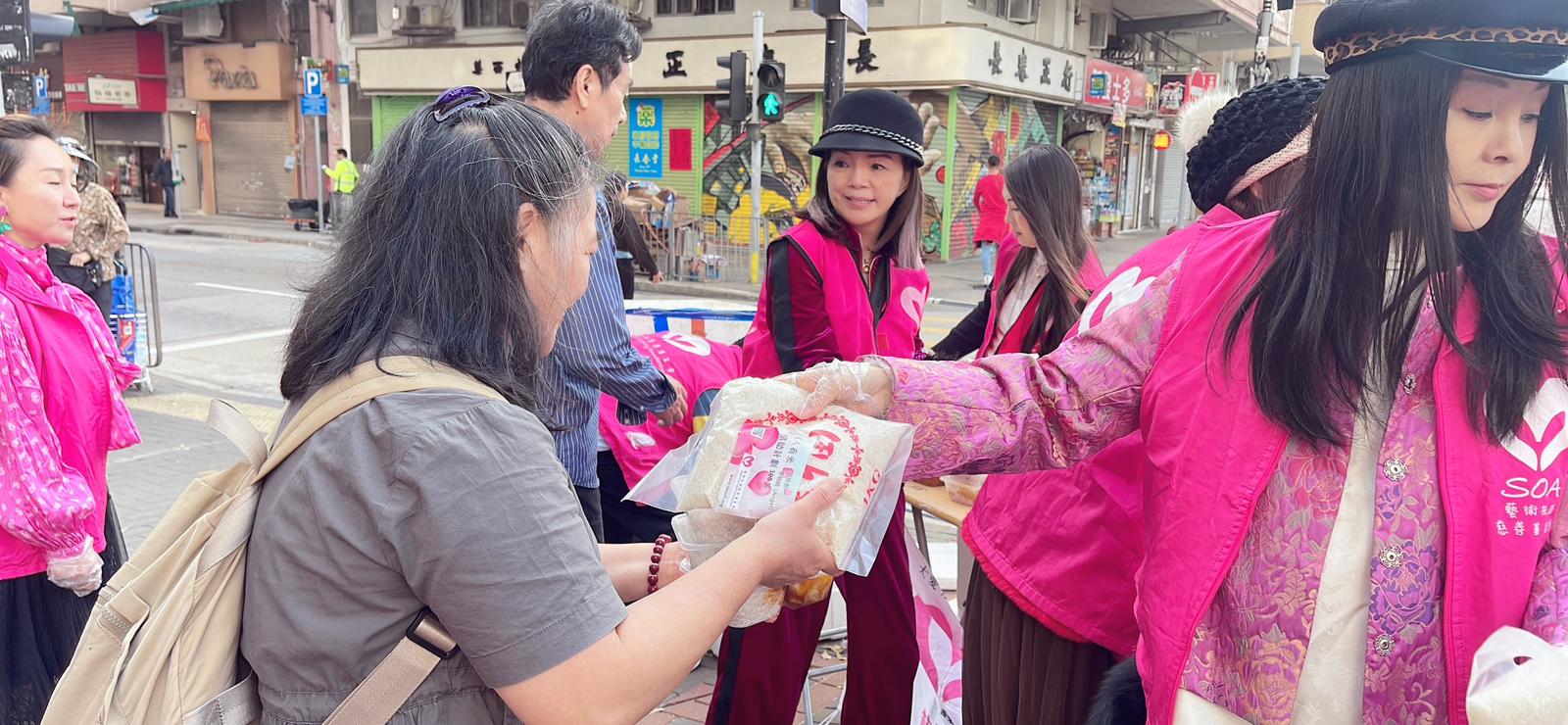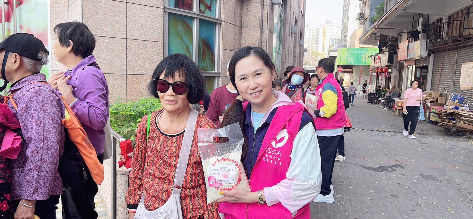 新春大年初二,社區送暖行動,送上新年祝福、吉祥、健康!愛心義工一早到場,佈置、維持秩序,今天物資有愛心米、愛膳飯合、福果、糖!