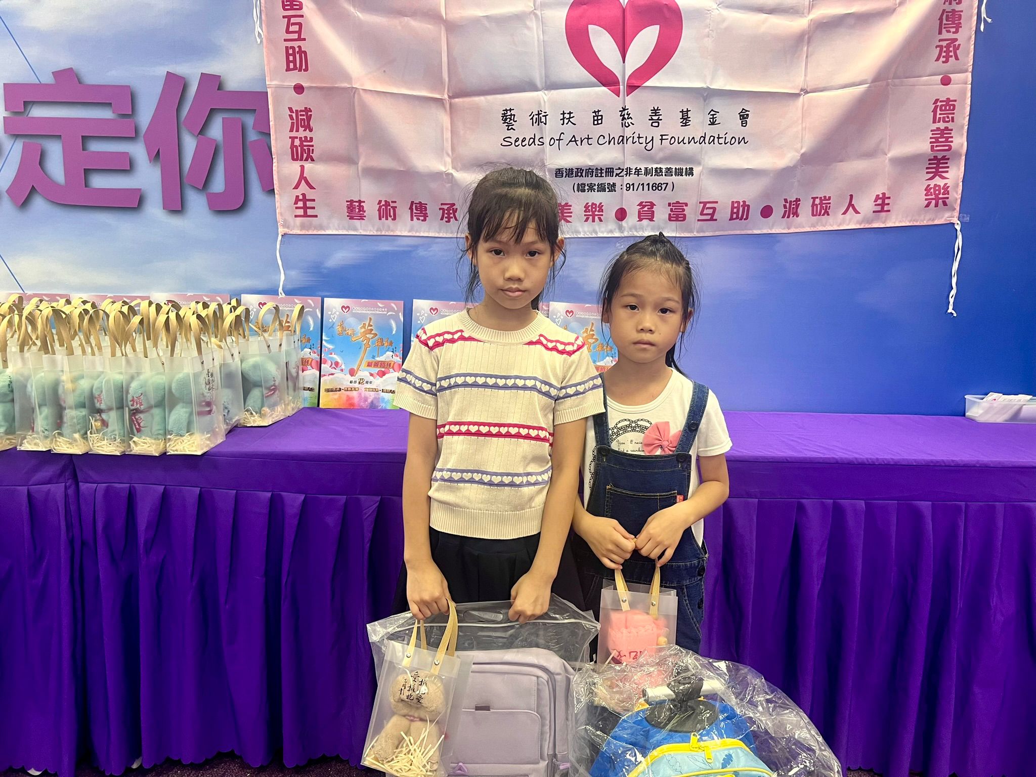 💖今天家長和學生,來到領取點,耐心排隊等候,大部分學生順利領取愛心書包,都好興奮,好開心,書包質量好高級,幼兒書包好可愛,實用又漂亮。還有藝苗「擁抱愛、愛擁抱」毛巾,贈送給學生們。